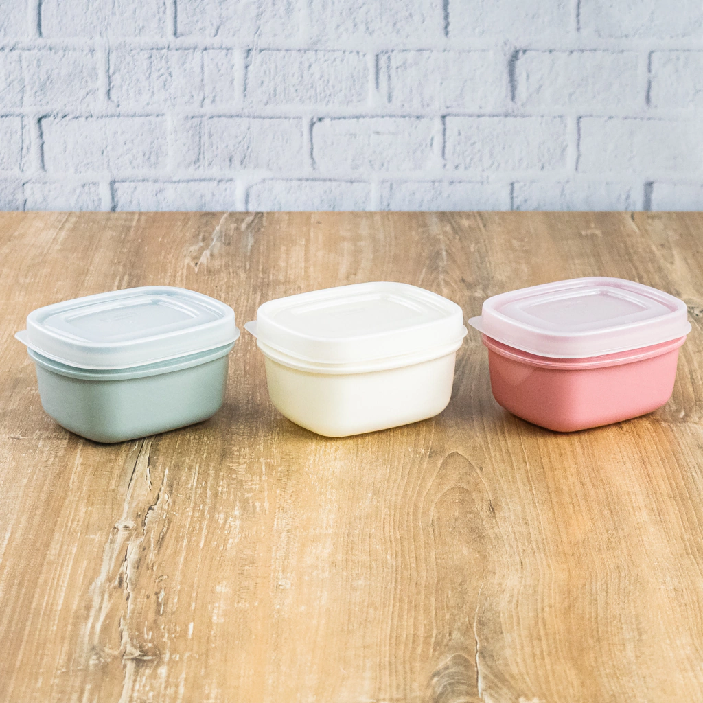 Hermético plástico cuadrado de 0.8 litros en colores beige, gris nórdico y rosa nórdico para almacenamiento compacto.