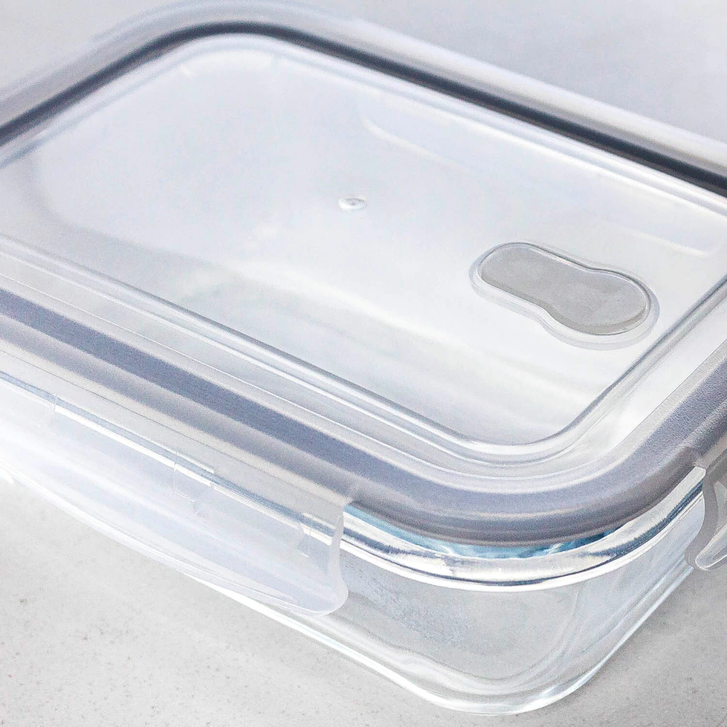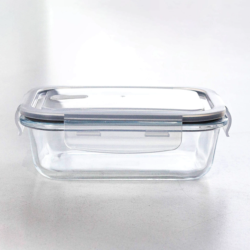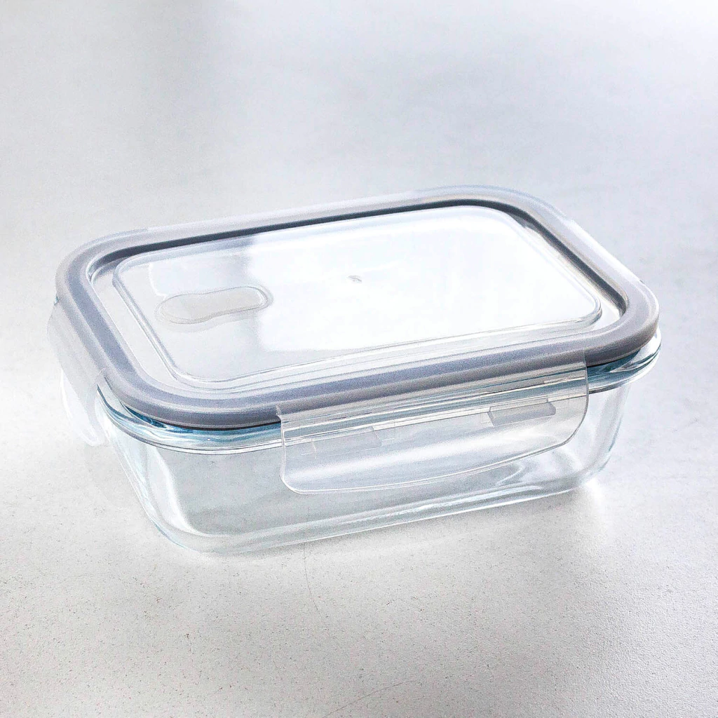 Hermético rectangular de vidrio con capacidad de 630 ml, en tono gris, perfecto para conservar tus alimentos con estilo.