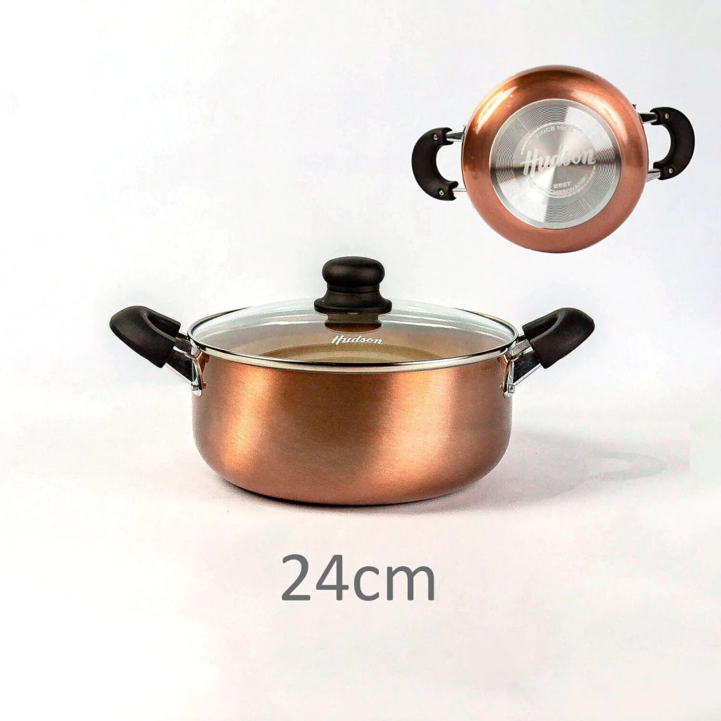Las piezas antiadherentes de alta resistencia, son duraderas y fáciles de limpiar. Su diseño degradado en color cobre y su mango siliconado aislante de calor, tapas de vidrio templado con válvula de vapor y difusor de calor le dará un toque elegante a tu cocina.